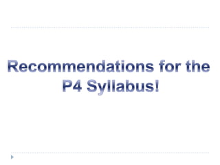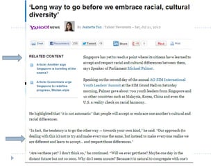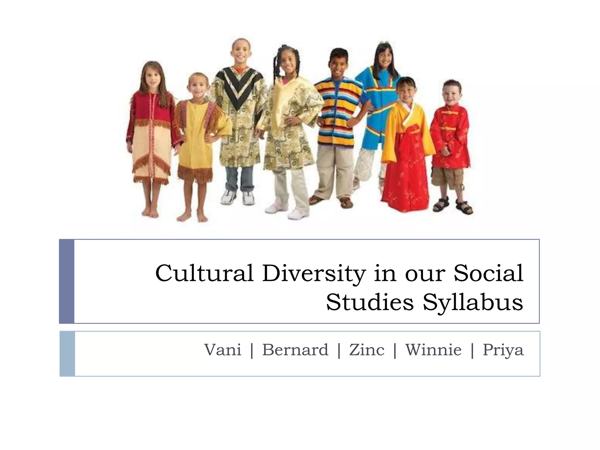 This document outlines a proposed social studies syllabus focusing on cultural diversity in Singapore. It includes quizzes, definitions of cultural diversity, perspectives from student teachers on the topic, and rationales for why cultural diversity should be taught. It then critiques chapters in sample P2 and P4 syllabi in terms of how well they teach about cultural diversity. Recommendations are provided such as incorporating more interactions between different communities and discussing diversity students can observe locally. The goal is for students to appreciate Singapore's diverse cultures while strengthening a shared national identity.