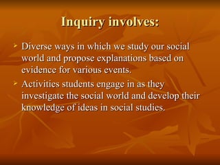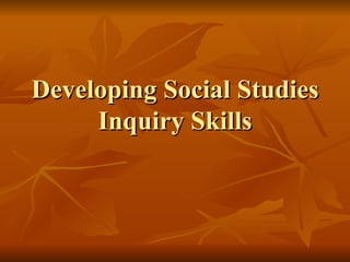 This document discusses developing social studies inquiry skills through concept attainment strategies. It provides examples of concepts taught in social studies like historical eras and core democratic values. Concept attainment engages students in developing concepts through identifying attributes, examples, comparisons, and generalizations. The strategy helps students organize facts and understand relationships between concepts in a way that facilitates deeper learning and ability to apply knowledge in new contexts.