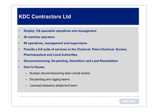 Stuart Shirreff is the Head of Safety and Assurance at KDC Contractors Limited, a company that employs 138 specialists to provide decommissioning, deconstruction, demolition, and land remediation services. KDC works for a variety of chemical, nuclear, and industrial clients. It owns its own nuclear decommissioning, rigging, and asbestos abatement teams. KDC is working to simplify its risk assessment documentation and enhance toolbox talks and daily pre-task risk assessments to further improve workforce safety. With a focus on safety, KDC has not had a RIDDOR reportable incident in over 6 years and has received numerous safety awards from clients and industry organizations.