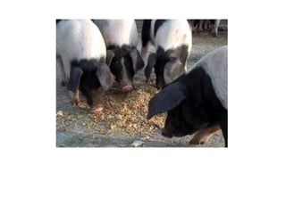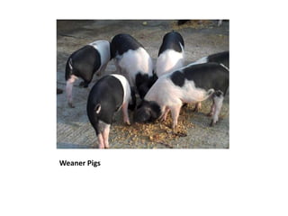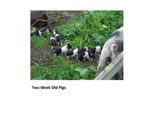 The document discusses various young farm animals including two week old weaner pigs, pigs ready for slaughter, chickens roosting, and a new born kid goat.
