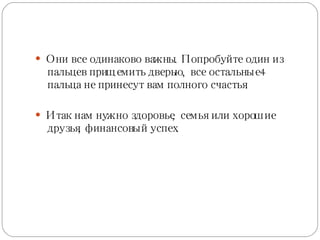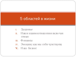 Документ подчеркивает важность баланса пяти ключевых областей жизни: здоровья, семьи, финансов, эмоций и бизнеса, которые необходимы для достижения счастья. Он акцентирует внимание на том, что успех и личностный рост часто происходят через преодоление проблем, которые способствуют изменениям и развитию. Автор утверждает, что финансовая свобода тесно связана с личностным ростом и способностью наслаждаться достигнутым.