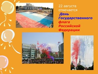 22 августа отмечается День государственного флага Российской Федерации, установленный в честь поднятия трехцветного флага в 1991 году. Этот флаг впервые был утвержден Петром Первым в 1705 году и заменил красный флаг с серпом и молотом в 1918 году, до того как был восстановлен в 1991 году. Празднование включает митинги, исполнение гимна и вывешивание флагов на домах и административных зданиях.