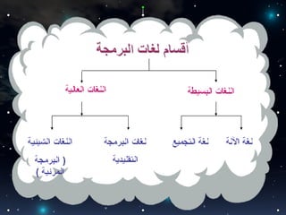 يوضح المستند مكونات الحاسب وأنظمة البرمجة، بما في ذلك مكونات البرمجيات والأجهزة وكيفية تصميم البرامج باستخدام لغات البرمجة. يتحدث عن برامج الحاسوب، وأهمية المترجم، وأنواع لغات البرمجة مثل اللغات البسيطة والعالية، وأهمية تحديد نوع البيانات. كما يشرح كيفية تعريف المتغيرات والعمليات الحسابية الأساسية وأولوية تنفيذها.
