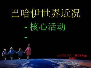 此文档讨论了巴哈伊信仰在当前社会危机中的位置,包括道德危机和物质追求的根源。它还介绍了通过核心活动和研习课程来促进个人与社会的积极变化。最后,分享了一些个人经历,展示这些活动如何改变个体和社区的生活。
