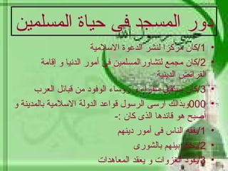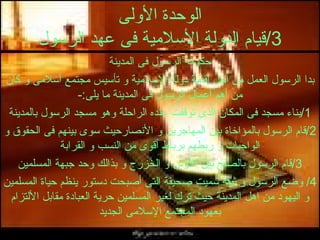 تتناول الوثيقة تأسيس الدولة الإسلامية في عهد الرسول محمد في المدينة، حيث عمل على بناء المسجد، والمؤاخاة بين المهاجرين والأنصار، وإبرام وثيقة تنظم حياة المسلمين واليهود. تشمل الوثيقة أيضاً الغزوات والمعارك التي خاضها المسلمون، مثل غزوة بدر، أحد، والخندق، ودور كل منها في تعزيز الدولة الإسلامية وتعزيز مكانة المسلمين. وتختتم الوثيقة بوفاة الرسول وتأثير الإسلام على المجتمع العربي من الجوانب الدينية والسياسية والاجتماعية والاقتصادية.