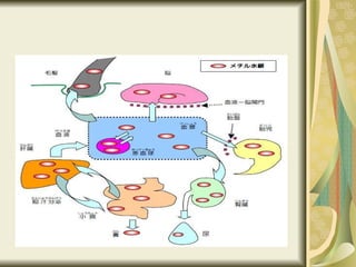 Mercury exists in metallic, inorganic, and organic forms. Metallic mercury is used in thermometers and fluorescent lamps and can cause pollution when used for gold mining. Organic mercury, specifically methyl mercury, forms from inorganic mercury in nature and accumulates up the food chain in fish and shellfish. Certain large predatory fish like swordfish and tuna can contain high levels of mercury due to its accumulation in the food chain. Mercury is distributed throughout the body with higher concentrations in the liver and kidneys. It is slowly excreted from the body over time through urine and stool.