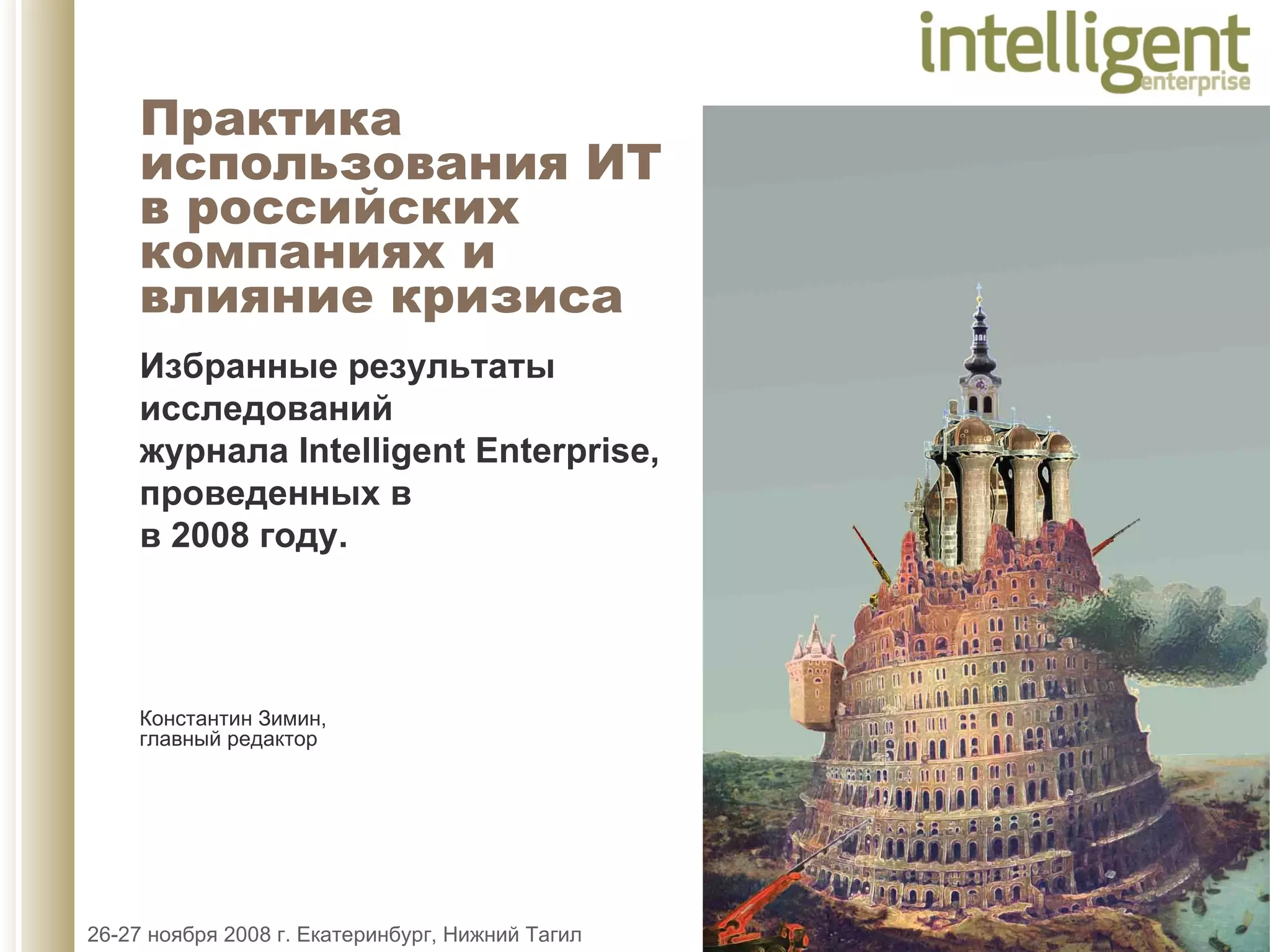 Документ содержит результаты исследований, проведенных в 2008 году по использованию IT в российских компаниях в условиях кризиса, включая анкетирование IT-директоров. Основное внимание уделяется сокращению IT-бюджетов, предстоящим изменениям и влиянию кризиса на различные отрасли. Также рассматриваются меры, принимаемые компаниями для оптимизации расходов и сохранения сотрудников.