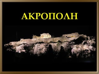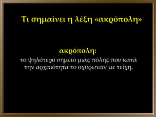 Τι σημαίνει ηλέξη «ακρόπολη» ακρόπολη: το ψηλότερο σημείο μιας πόλης που κατά την αρχαιότητα το οχύρωναν με τείχη.