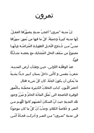 تمرون هي مدينة كبيرة وجميلة تقع في مكان رائع ولكنها تعاني من مشكلات تتعلق بالبنية التحتية والتوظيف. في المدينة العديد من المعالم والفواكه مثل التمر، ويشعر الناس بفخر كبير تجاه تراثها وثقافتها. على الرغم من التحديات، يسعى السكان لتحقيق التنمية والازدهار في مجتمعهم.
