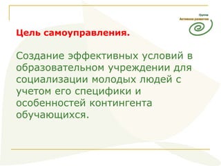 Документ обсуждает правовые основы организации самоуправления обучающихся в образовательных учреждениях, акцентируя внимание на важности социализации и правовой грамотности среди различных участников образовательного процесса. Он включает перечень нормативных документов, касающихся прав детей и принципов самоуправления, а также подчеркивает необходимость уважения к правам человека и стимулирование участия обучающихся в управлении. Основные цели заключаются в создании эффективных условий для развития гражданской правовой культуры среди молодежи.