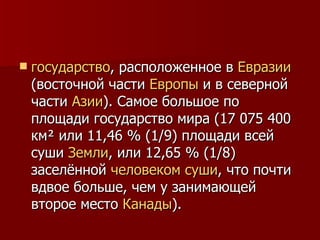 Российская Федерация — самое большое по площади государство мира, занимающее 17 075 400 км² и с населением 141 895 500 человек по состоянию на 1 ноября 2008 года. Основная часть населения проживает в европейской части страны, а большинство жителей составляют русские (79,83%). Россия граничит с 18 странами, имея самый большой показатель среди государств мира.