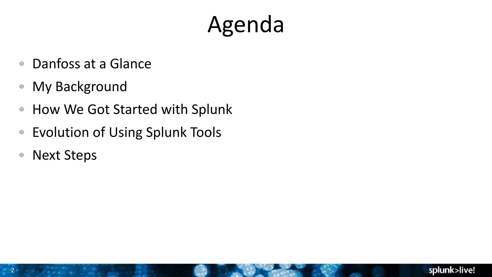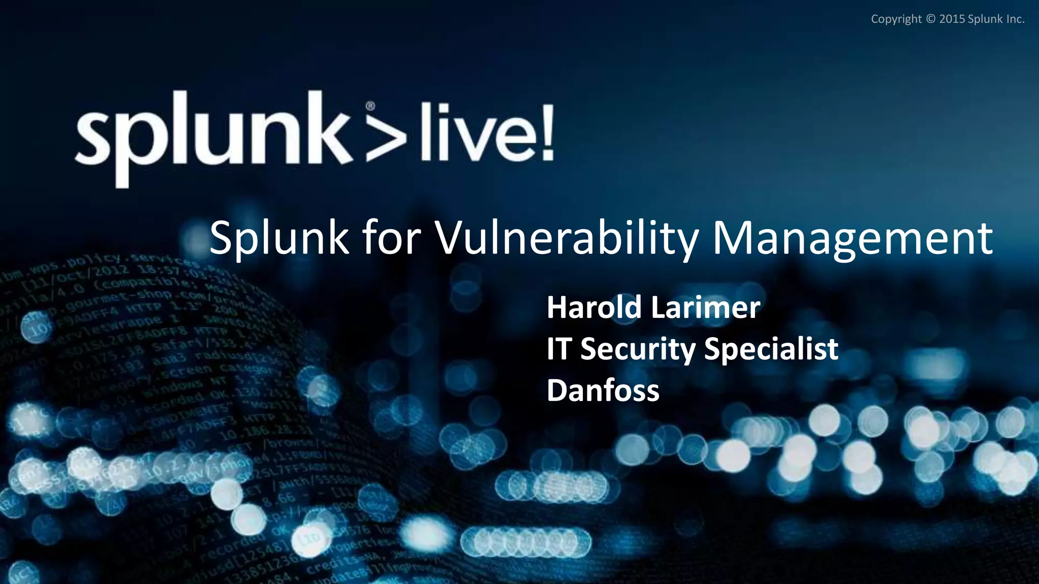 This document summarizes a presentation about Danfoss' use of Splunk for vulnerability management. It provides an overview of Danfoss, the background and experience of the presenter, how Danfoss got started with Splunk in 2008 to meet log collection and retention requirements, and how their use of Splunk has evolved over time to include dashboards, security, automated alerting, and a Sophos antivirus case study. It outlines next steps of expanding Splunk's use to more teams and exploring advanced analytics.