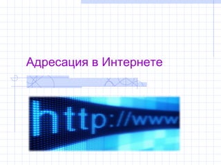 Документ охватывает основы адресации в интернете, включая IP-адреса, доменные имена и систему DNS. Описывается структура доменных имен, их уровни и признаки, а также необходимость преобразования символических адресов в цифровые при передаче данных. URL является уникальным адресом каждого документа в интернете, состоящим из протокола, адреса сервера и пути к ресурсу.