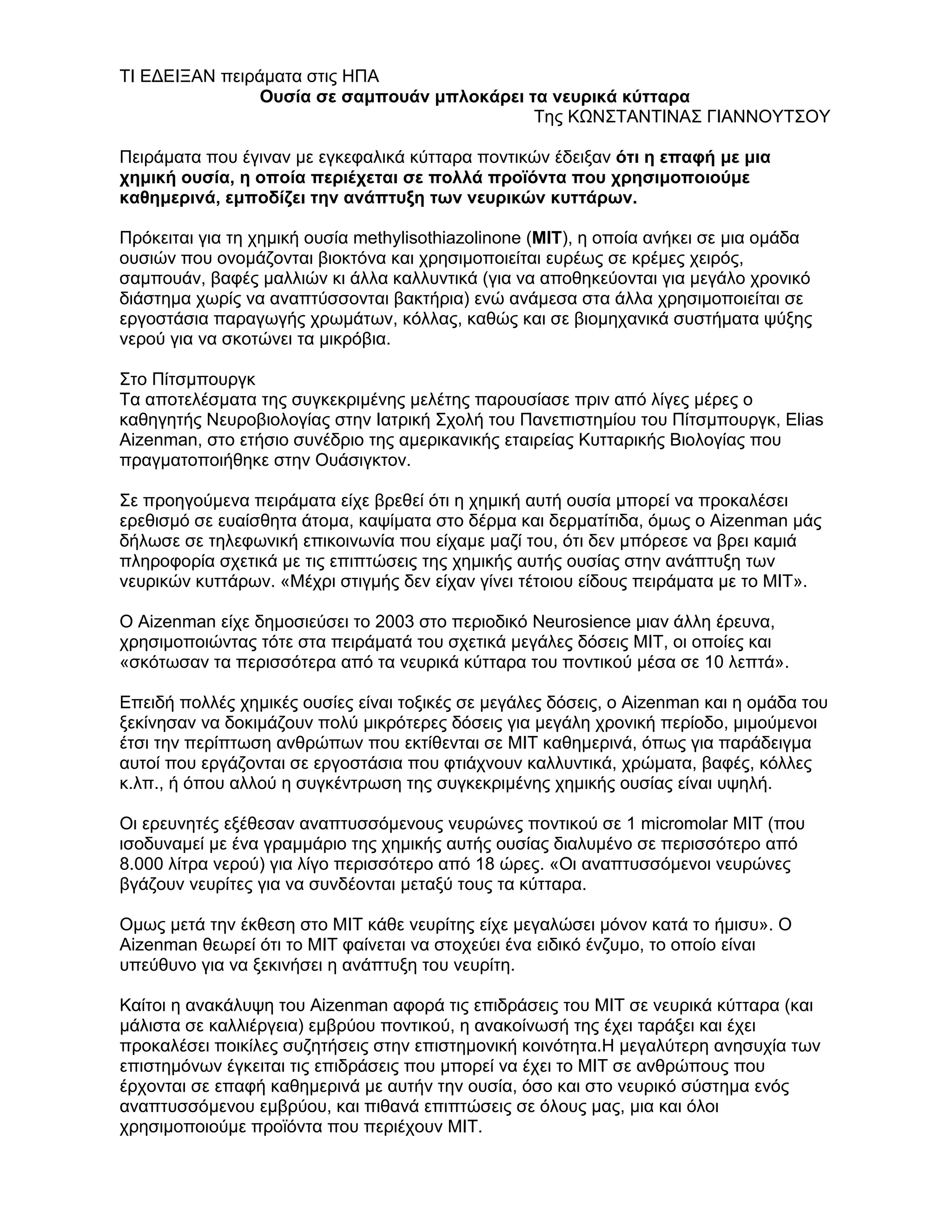 Πρόκειται για τη χηµική ουσία methylisothiazolinone (ΜΙΤ), η οποία ανήκει σε µια οµάδα