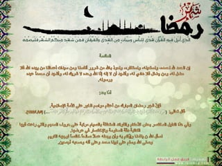 الوثيقة تتحدث عن أهمية صوم رمضان وأجره العظيم عند الله، مؤكدة على ضرورة الاحتساب والإيمان في العبادة. تشير إلى الفضل في القيام والتراويح في هذا الشهر الكريم، وتبرز بعض الأحاديث النبوية المتعلقة بالصيام ومريد الخير والصدقة في رمضان. كما تتطرق إلى أهمية حفظ الجوارح والابتعاد عن المعاصي أثناء الصيام.