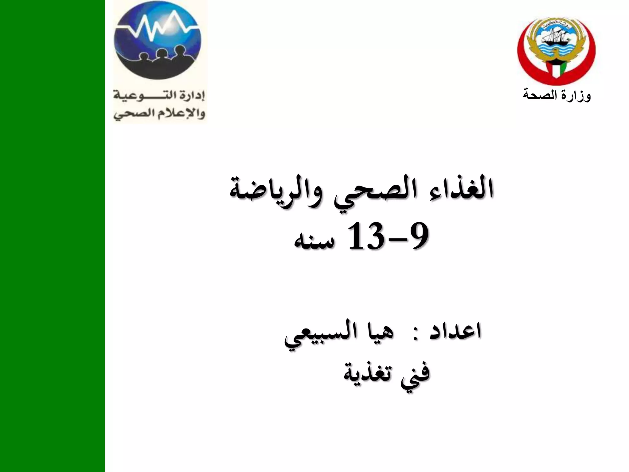 تتناول الوثيقة أهمية التغذية الصحية للأطفال من عمر 9 إلى 13 سنة، حيث توضح المجموعات الغذائية الأساسية التي يحتاجونها مثل الخبز والخضروات والفواكه والحليب واللحوم. كما تؤكد على ضرورة ممارسة الرياضة وشرب الماء بشكل كافي لتعزيز الصحة العامة. الوثيقة تقدم إرشادات حول الكميات المناسبة من كل مجموعة غذائية لاحتياجاتهم اليومية.
