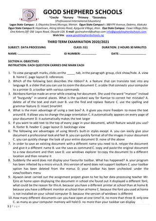 This document contains information about Good Shepherd Schools including campus locations and contact details. It also contains a third term examination for Data Processing class including sections on objectives, theory, and practical tests. The objectives section contains 40 multiple choice questions testing knowledge of Microsoft Word, Excel, and databases. The theory section contains questions requiring explanations of key terms. The practical test section requires writing out steps to perform common tasks in the software applications.