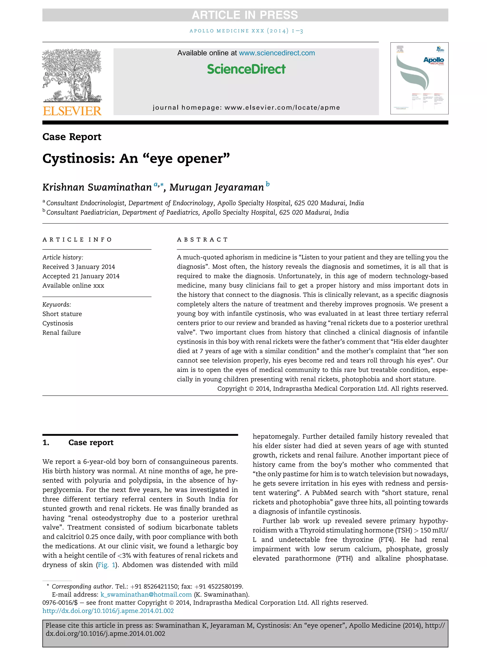 The document presents a case report of a 6-year-old boy diagnosed with infantile cystinosis after being misdiagnosed with renal rickets. Key historical details, including family history and symptoms like severe photophobia, led to the correct diagnosis and initiation of appropriate treatment with cysteamine. This case emphasizes the importance of thorough patient history in diagnosing rare conditions to improve treatment outcomes.