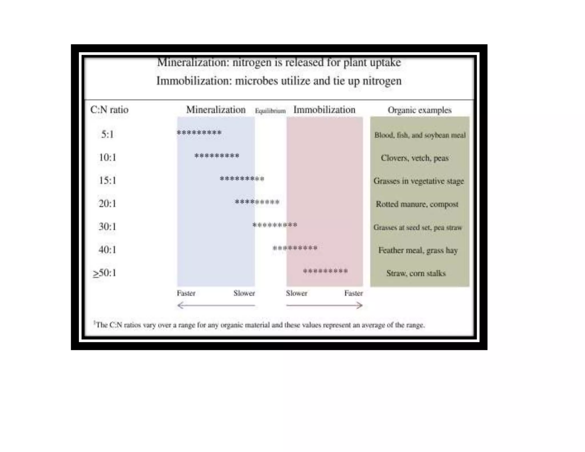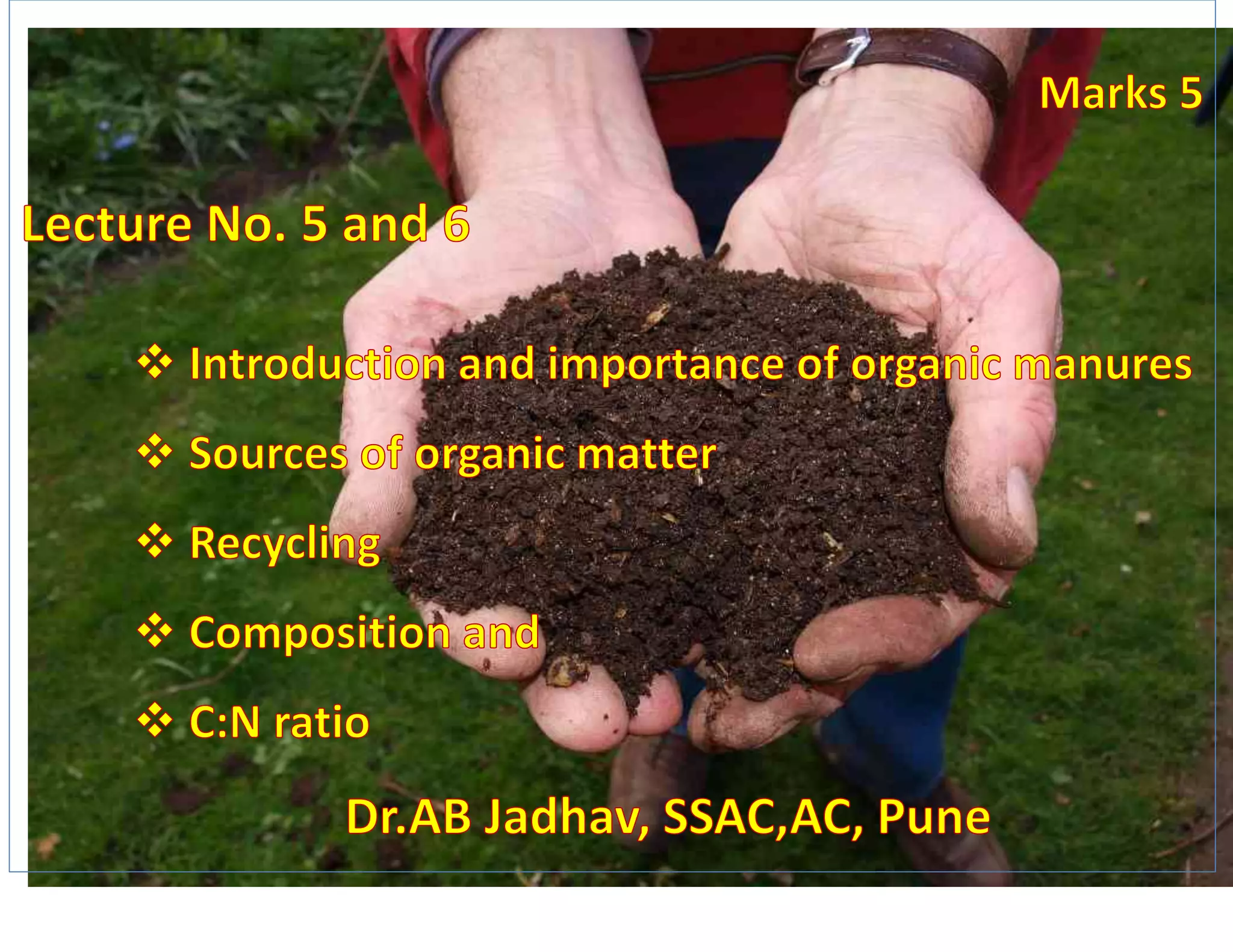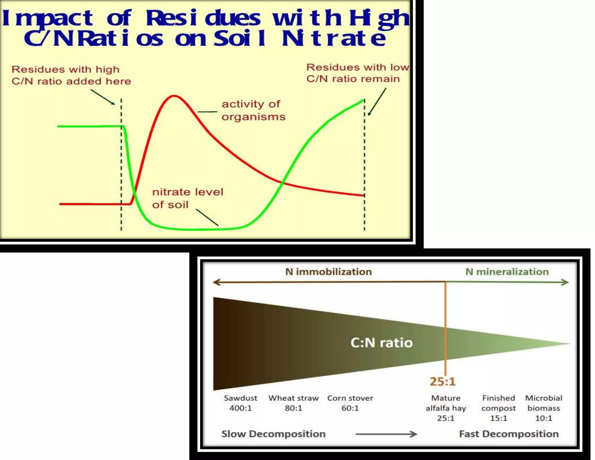 The document discusses the significance of organic manures, their decomposition, and the importance of the carbon-to-nitrogen (C:N) ratio in soil health. It explains how organic matter influences nutrient availability, soil properties, and microbial activity, emphasizing that the C:N ratio affects the rate of decomposition and nutrient release. Additionally, it categorizes organic material sources and outlines the roles of various microbes and environmental conditions in composting and nutrient cycling.