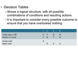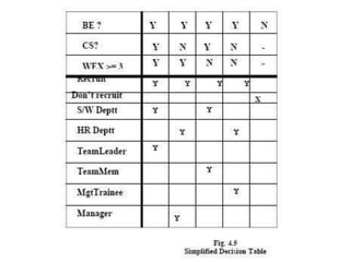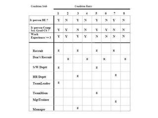 This document discusses decision tables and provides an example. It defines a decision table as a logical structure that considers all possible combinations of conditions and resulting actions. An example decision table is given showing different discount percentages given to orders based on customer type and order size. The document then provides more details on decision tables, including that they have condition and action stubs to specify the conditions being analyzed and actions taken. It outlines the steps for developing decision tables, including identifying essential factors/conditions and possible actions, calculating combinations, and filling in the table while eliminating impossible or consolidated rules.