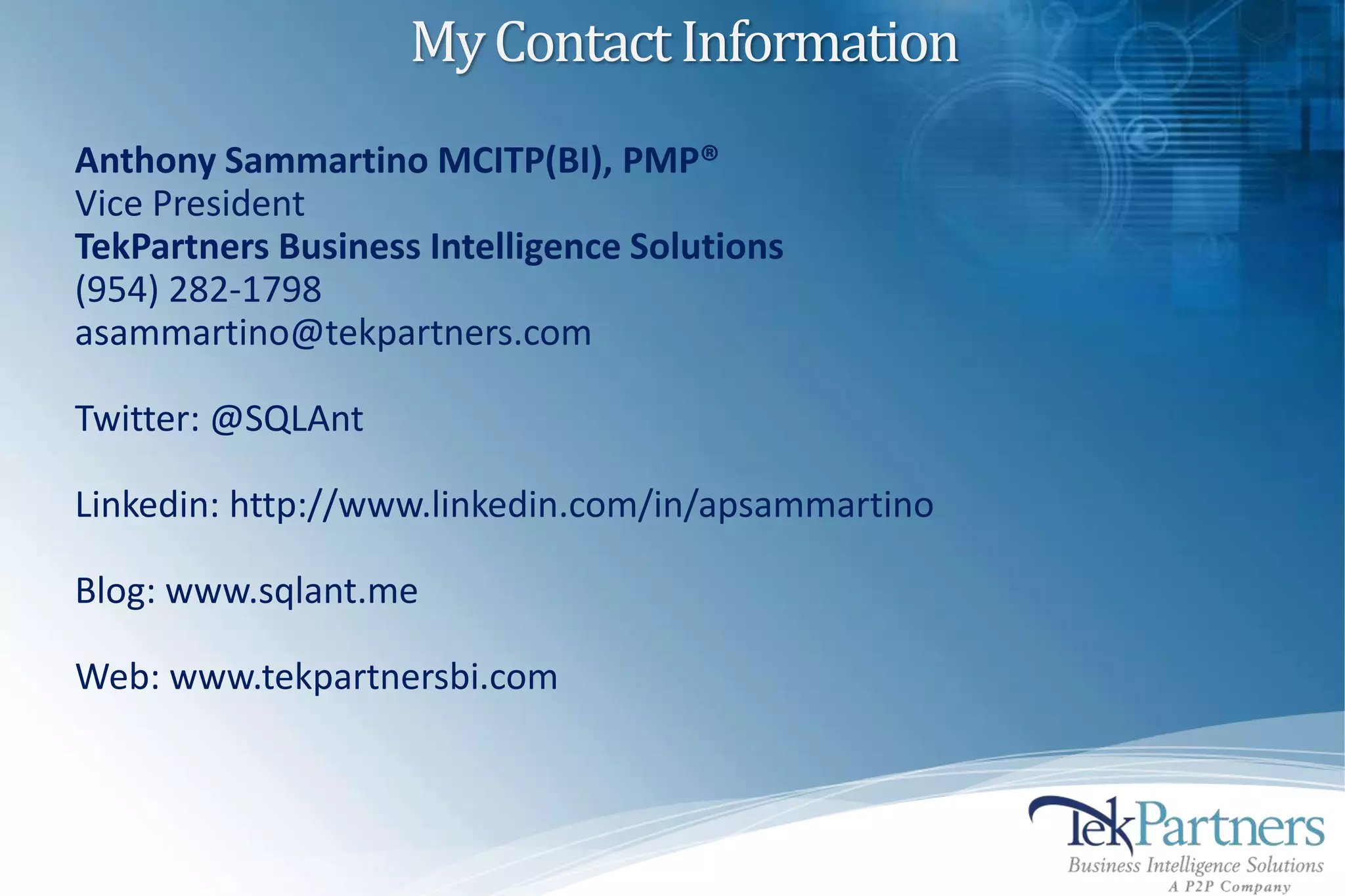 The document is a presentation by Anthony Sammartino on self-service business intelligence and the Microsoft BI semantic model, focusing on SQL Server Analysis Services (SSAS) Tabular. It highlights key tools such as Excel, PowerPivot, Power View, and emphasizes the importance of learning DAX for easier data management. The presentation concludes with takeaway points and an invitation for questions, aiming to educate the audience on the capabilities of the discussed technologies.
