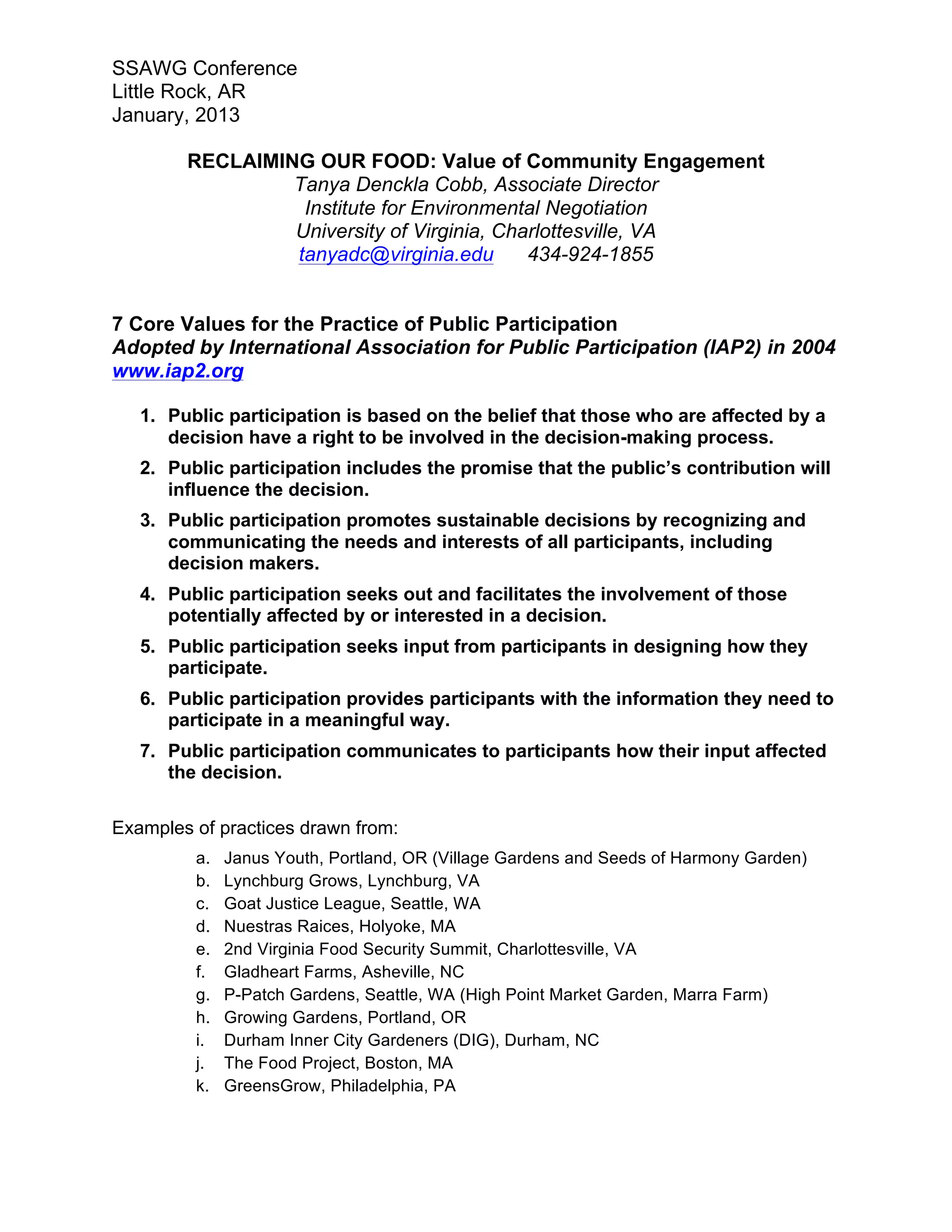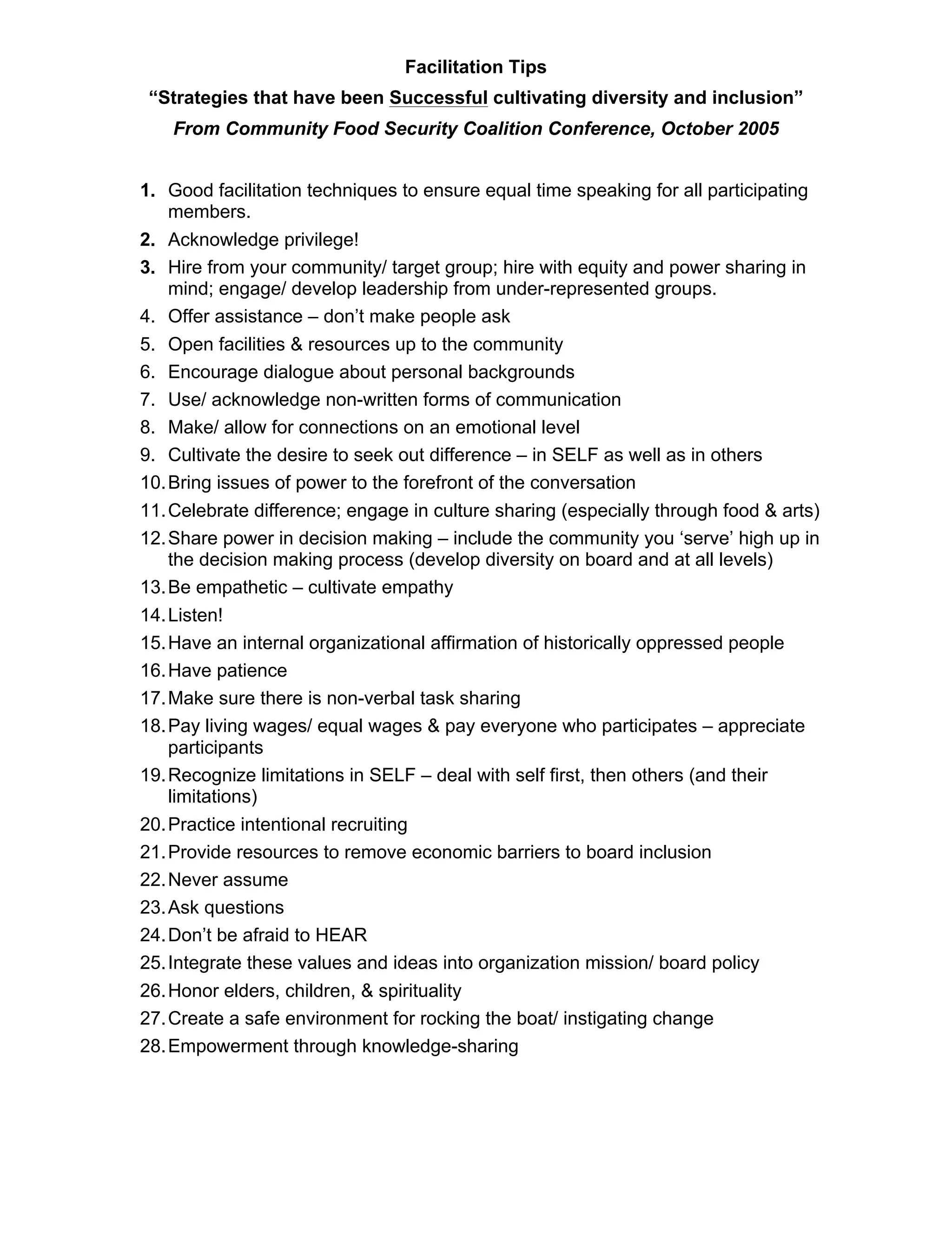 This document summarizes a conference on reclaiming community engagement around food. It lists the 7 core values of public participation adopted by the International Association for Public Participation, which focus on inclusion and transparency in decision making. Examples are then given of 10 community organizations that exemplify these values through various community gardening and food justice projects. The document concludes with 28 facilitation tips for cultivating diversity and inclusion, such as acknowledging privilege, sharing power and decision making, listening to understand different perspectives, and creating a safe space for meaningful dialogue.