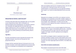 Winstverbetering, kostenreductie en procesoptimalisatie Postmerger © verbeterprogramma Winstverbetering, kostenreductie en procesoptimalisatie Zeker als ook gekeken wordt naar een ‘Competence Center’, dat vind ik zelf Winst verbet ering ants Org anis de mooiste variant. Hierbij ligt het accent meer op het verder atieadv Ver and ies consult ering Overt Pro ces Pr ojecto uig en r ganisa ck tie ment Manag ch e de ambi Feedba tie Analytis Actiepla n manage Compe tentieo ntwikk Eendu eli ng idige bood schap Draagv Afdel lak professionaliseren van de dienstverlening, kan de organisatie versterken Senior ingsov erstijg ende Gesp reksp concep ten artne r ur Ketens seigenaren ties amenh ang Reg isse Scena ri o’s Gedr ag Interven Best pract Proce Betro ices uwba ar waar zij goed in is en neemt de onderscheidendheid met de concurrentie den Comm unicat ie Veran derdo Sturen el ductie Metho Verand Samen teit ercapa ci d Kostenre de org met anisatie Big Fou r achterg ron d toe. Postmerger duurzaam identificeren en oplossen van knelpunten in organisaties Aansturing Belangrijk bij het overwegen van een SSC is om te redeneren vanuit de Shared Service Centers, werkt het echt? doelstellingen van de organisatie en als het SSC inmiddels is opgezet, om de doelstellingen regelmatig te herijken. Past de werkwijze van het SSC nog Uit diverse onderzoeken blijkt dat een belangrijke reden voor het opzetten bij de strategie? Door ontwikkelingen in het SSC kunnen de rollen van een ‘Shared Service Center’ (SSC) is het bereiken van verschuiven van meer repeterend naar tactisch of adviserend en dit is van efficiencyverbetering (lees kostenbesparing) in de organisatie. Zelf heb ik invloed op de aansturing. ook in de praktijk veel meegemaakt dat het om deze reden wordt opgezet. Helemaal niks mis mee om ‘verspilling’ in de organisatie door Relevant is bij het SSC om voor zo concreet mogelijke ‘Key Performance ondoorzichtige werkprocessen of sturing tegen te gaan, als er dan ook Indicators’ (KPI’s) te zorgen om bijvoorbeeld zowel de proces-, competentie- maar oog is voor verdere verbetering van de dienstverlening. Waarom en financieel gerichte KPI’s te meten. Deze KPI’s dienen dan zoveel eigenlijk? mogelijk in lijn te liggen met de KPI’s gebaseerd op de strategische doelstellingen. Type SSC’s Door de KPI’s op strategisch, tactisch en operationeel niveau te laten Een SSC is bijvoorbeeld een externe organisatie die processen uit de aansluiten (dit betekent overigens niet dat ze altijd hetzelfde hoeven te zijn) organisatie overneemt, maar dit kan ook heel goed een intern kan voorkomen worden dat veel energie in de organisatie verloren gaat aan georganiseerd SSC zijn. activiteiten met minder toegevoegde waarde (de NAVA’s, ‘Non-Added-Value Activities’). Overigens hoeft een organisatie helemaal niet heel groot te zijn om over een SSC na te denken, vanaf honderd medewerkers kan het al de moeite Extern SSC met meerdere aandeelhouders waard zijn om afhankelijk van de doelstelling naar de haalbaarheid te kijken. Nog complexer is de aansturing als het een extern SSC betreft Postmerger, duurzaam identificeren en oplossen van knelpunten in organisaties Postmerger, duurzaam identificeren en oplossen van knelpunten in organisaties