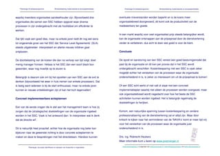 Winstverbetering, kostenreductie en procesoptimalisatie Postmerger © verbeterprogramma Winstverbetering, kostenreductie en procesoptimalisatie waarbij meerdere organisaties aandeelhouder zijn. Bijvoorbeeld drie eventuele misverstanden worden beperkt en is de koers meer organisaties die samen een SSC hebben opgezet waar diverse organisatiebreed doorgevoerd, dit komt ook de productiviteit van de processen in zijn ondergebracht met als hoofddoel om efficiënter te medewerkers ten goede. werken. In een markt waarbij voor veel organisaties prijs steeds belangrijker wordt, Dat lijkt vaak een goed idee, maar na enkele jaren leidt dit nog wel eens kan de organisatie ontsnappen aan de prijsspiraal door de dienstverlening tot ongeremde groei van het SSC dat ‘Service Level Agreements’ (SLA) verder te verbeteren, dus echt te doen wat goed is voor de klant. steeds uitgebreider interpreteert en allerlei nieuwe initiëren gaat ontplooien. Conclusie De doorbelasting van de kosten die dan na verloop van tijd volgt, doet De opzet en aansturing van een SSC vereist een goed besturingsmodel dat menig manager fronsen. Helaas is het SSC dan een soort black box past bij de organisatie en dit kan per proces dat in het SSC wordt geworden, waar nog moeilijk op te sturen is. ondergebracht verschillen. Kostenbesparing met een SSC is vaak zeker mogelijk echter het versterken van de processen waar de organisatie Belangrijk is daarom ook om bij het opzetten van een SSC aan de exit te onderscheidend in is, is zeker zo interessant om uit de prijsspiraal te komen! denken (bijvoorbeeld het weer in huis nemen van enkele processen). Dat is lastig want iedereen is bij de start enthousiast, maar na enkele jaren Of een SSC echt werkt of niet valt of staat met een concreet kunnen er nieuwe ontwikkelingen zijn of kan het toch tegenvallen! implementatieplan waarbij niet alleen de processen worden overgezet, maar ook organisatiebreed wordt nagedacht over hoe het beste de SSC Concreet implementeerbare actieplannen activiteiten kunnen worden ingebed. Het is belangrijk regelmatig de doelstellingen te herijken. Een van de eerste vragen die ik stel aan het management team is hoe zij zorgen dat de (strategische) doelstellingen van de organisatie ingebed Kortom, een natuurlijke spanning tussen kostenbesparing en verdere worden in het SSC. Vaak is het antwoord dan: ‘ik interpreteer wat ik denk professionalisering van de dienstverlening zal er altijd zijn. Maar door dat de directie wil’. kritisch te kijken naar het verminderen van de ‘NAVA’s’ komt er meer tijd vrij voor het versterken van de processen waar de organisatie juist Dit is natuurlijk heel proactief, echter hoe de organisatie nog beter kan onderscheidend in is. Winst verbet ering ants Org anis atieadv Ver and ies consult ering Overt Pro ces Pr ojecto uig en r ganisa ck tie ment Manag ch e de ambi Feedba tie bijsturen naar de gewenste richting is door concrete actieplannen te Analytis Actiepla n manage Compe tentieo ntwikk Eendu eli ng idige bood schap Draagv Afdel lak Senior ingsov erstijg ende Gesp reksp concep ten artne r ur Ketens seigenaren ties amenh ang Reg isse Scena ri o’s Gedr ag Interven maken en deze te besprekingen met het directieteam. Hierdoor kunnen Drs. ing. Robrecht Heukers Best pract Proce Betro ices uwba ar den Comm unicat ie Veran derdo Sturen el ductie Metho Verand Samen teit ercapa ci d Meer informatie kunt u lezen op www.postmerger.nl Kostenre de org met anisatie Big Fou r achterg ron d Postmerger, duurzaam identificeren en oplossen van knelpunten in organisaties www.heukersadvies.nl is eigenaar van www.postmerger.nl, www.ikhebplanschade.nl en www.mijnzienswijze.nl.