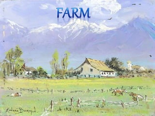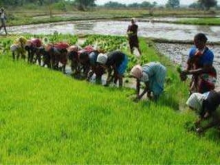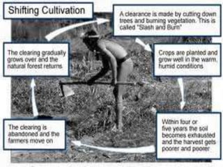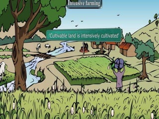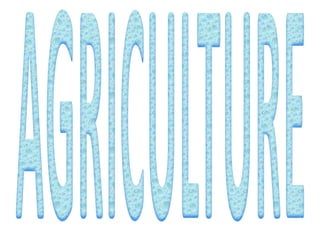 This document discusses different types of agriculture including subsistence farming, commercial farming, and plantation agriculture. It also describes important crops grown around the world like wheat, rice, cotton, tea, and coffee. Key features of Indian and US agriculture are outlined such as farm size, use of technology, irrigation, and role of monsoons in India.