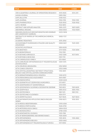 This document provides a list of publication titles and associated information like ISSN numbers for sources covered by the Web of Science Science Citation Index Expanded in 2011. There are thousands of journal titles listed across many scientific disciplines like engineering, biology, medicine, physics and more. The document aims to outline all of the peer-reviewed sources that are indexed for bibliographic information and cited reference searching in the Web of Science database.
