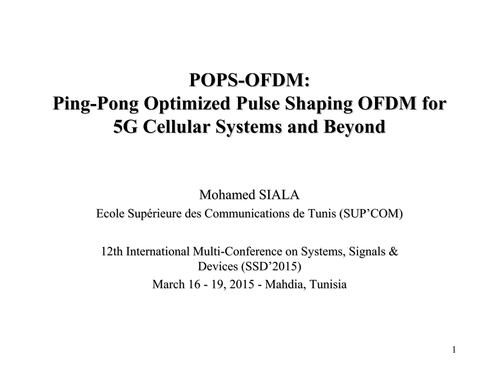 The document discusses 'pops-ofdm,' a pulse shaping method for Orthogonal Frequency Division Multiplexing (OFDM) aimed at addressing challenges in 5G cellular systems. It highlights the motivation for research, the need for non-orthogonal waveforms, and outlines various recent EU research projects in wireless technology. Key issues include the growing demands of the Internet of Things, low-latency requirements, and the inefficiencies in current LTE technologies.