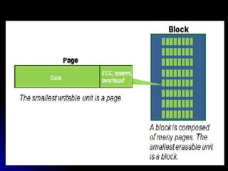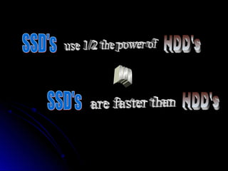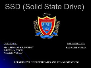SSDs use solid state memory like NAND flash instead of spinning disks to store data. SSDs access data much faster than hard disk drives and have no moving parts, providing benefits like higher reliability, lower power consumption, and silent operation. An SSD contains a controller, flash memory, and an interface to connect to a computer or device. The controller manages the flash memory by mapping data to pages and blocks. SSDs are being used increasingly in devices like laptops, servers, and cameras due to their faster speeds and reliability compared to HDDs.