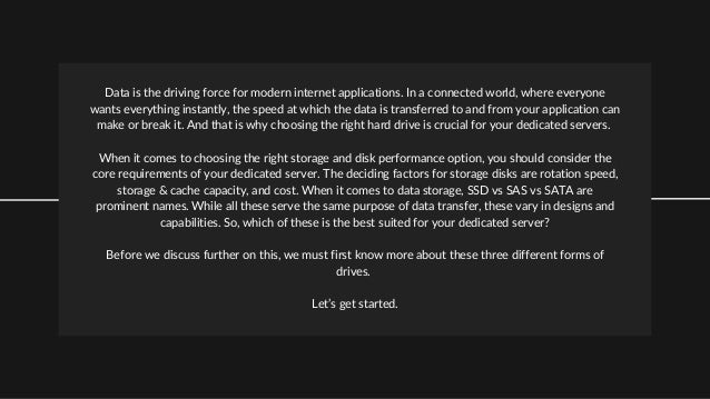 The document compares three types of hard drives—SAS, SSD, and SATA—for dedicated servers, emphasizing their differences in speed, reliability, and suitability for various applications. SAS drives are best for high-performance needs, offering redundancy and improved efficiency, while SSDs excel in speed and power efficiency, ideal for transactional data. SATA drives, though not as fast, provide greater storage capacity and affordability, making them suitable for general data storage needs.