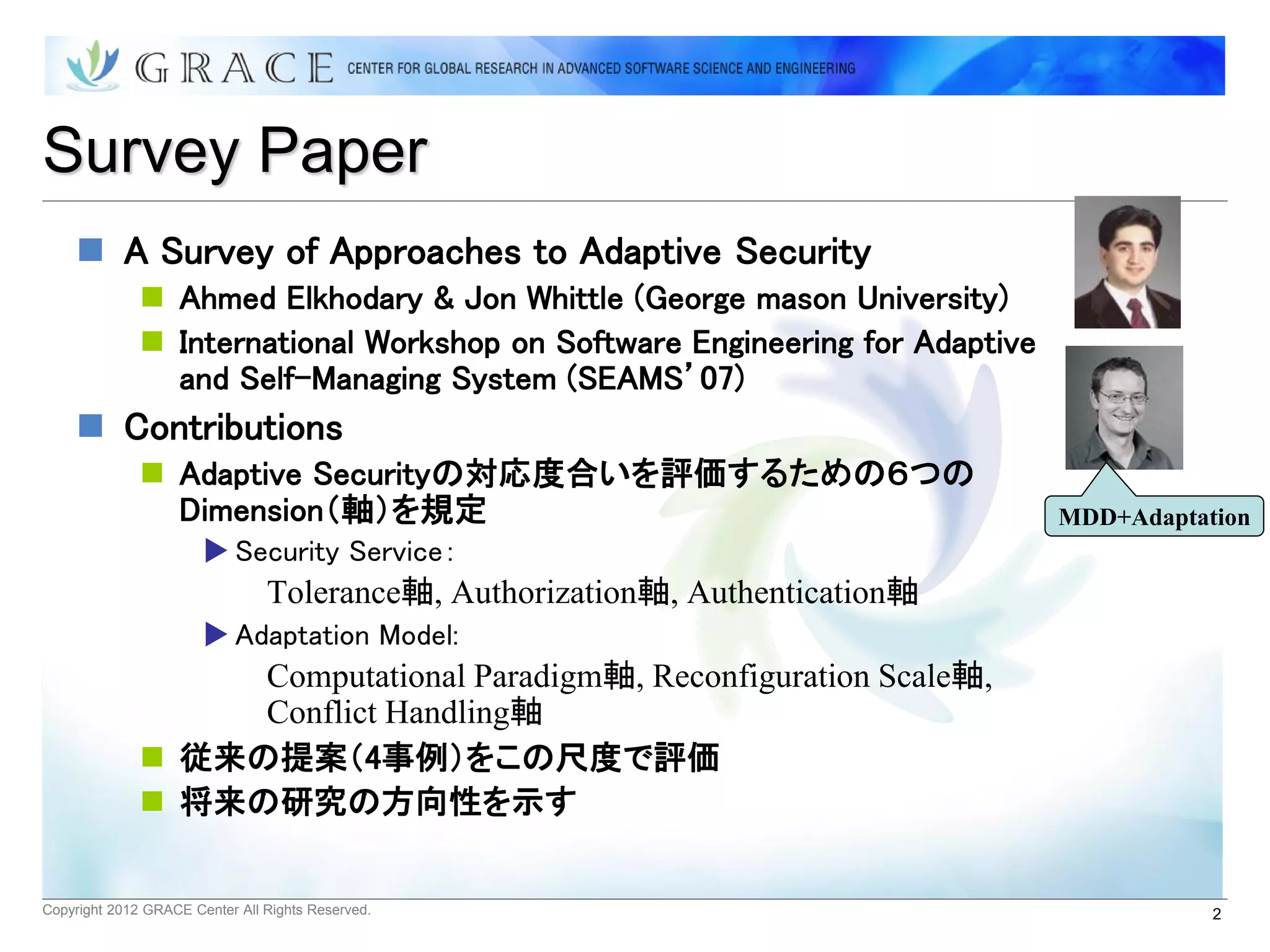 Ahmed Elkhodary & Jon Whittle : "A Survey of Approaches to Adaptive Security", International Workshop on Software Engineering for Adaptive and Self-Managing System (SEAMS’07)