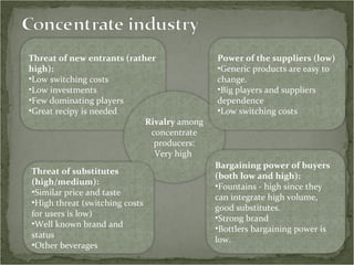 The document analyzes the competitive environment of the soft drink concentrate and bottling industries using Porter's Five Forces framework. It finds: