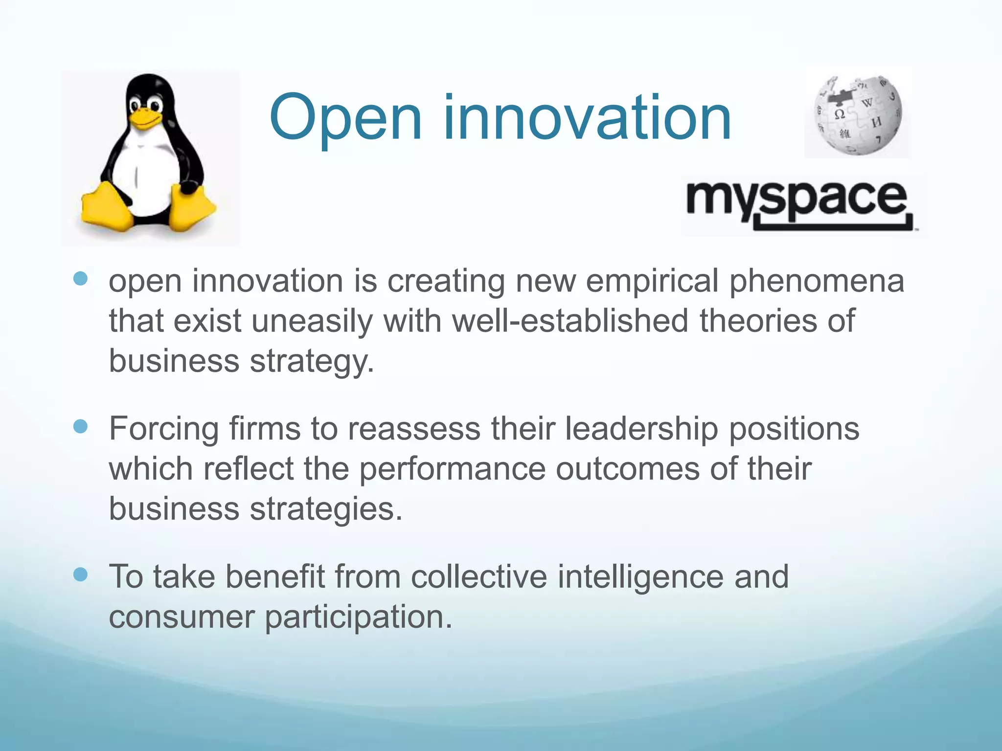 Open innovation and open strategy aim to balance value creation and capture through collaboration. Four open business models were identified: deployment, hybridization, complements, and self-service. While traditionally used in IT, open initiatives are expanding to other industries like life sciences. Challenges include sustaining participation over time and corporate domination. Traditional business strategy perspectives on cooperation and value chain management can help open initiatives succeed long-term. For example, California's Apps for California contest crowdsourced ideas for improved government through an open innovation approach.