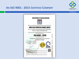 This document is from a company called SHREE SULAJ ENVIROTECH PRIVATE LIMITED that provides testing and certification services for cleanrooms and mini environments. It is ISO 9001:2015 certified. The company offers on-site testing, balancing and adjustment services, consultancy, education and training. It has experience working with clients in various industries like pharma, hospitals, semiconductors, food, and more. The document provides details on its services, clients, associates, and contact information.