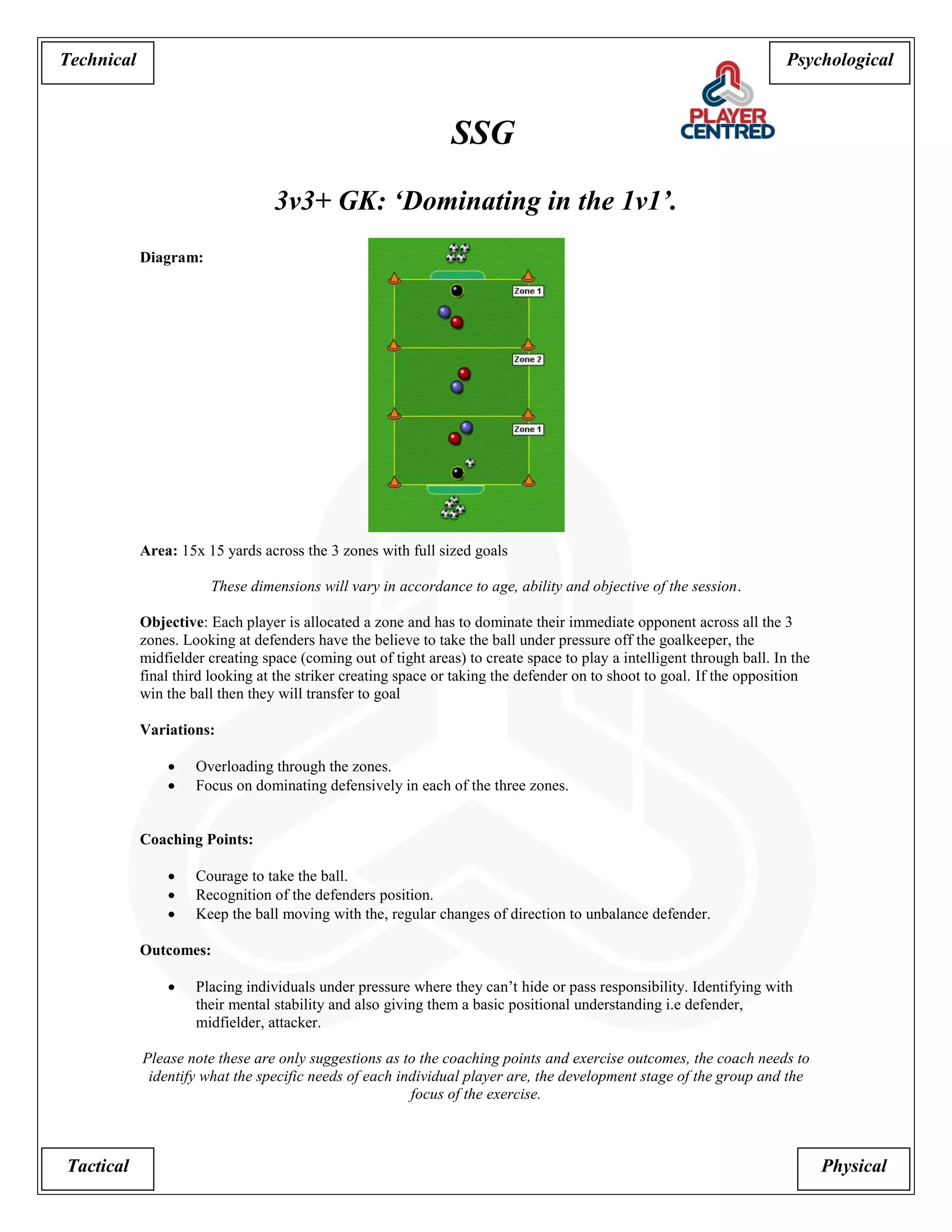 This document describes several small-sided game (SSG) exercises focusing on different tactical and technical objectives. The exercises involve 3v3 or 3v2 scenarios within confined areas and include variations and coaching points. The general format includes a diagram of the playing area, objective of the exercise, potential variations, and coaching points to emphasize during play.
