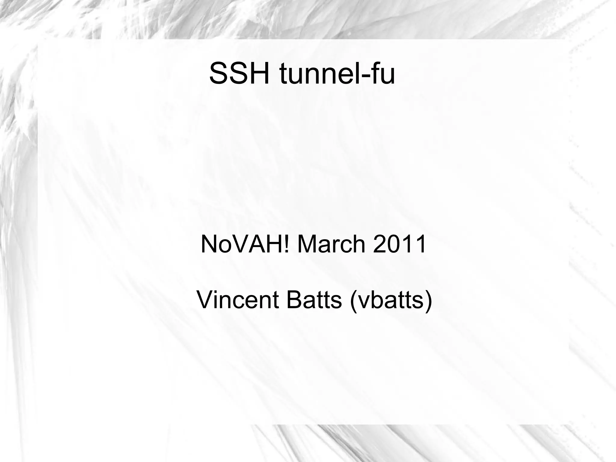 This document discusses using SSH tunnels, known as "SSH tunnel-fu", to securely forward network connections over an encrypted SSH connection. It describes three types of SSH tunnels - local, remote, and dynamic tunnels - and how to configure each using SSH flags or the SSH configuration file. It also provides examples of using tunnels to access internal servers remotely, create SOCKS proxies, and set up multi-hop tunnels through gateway hosts.