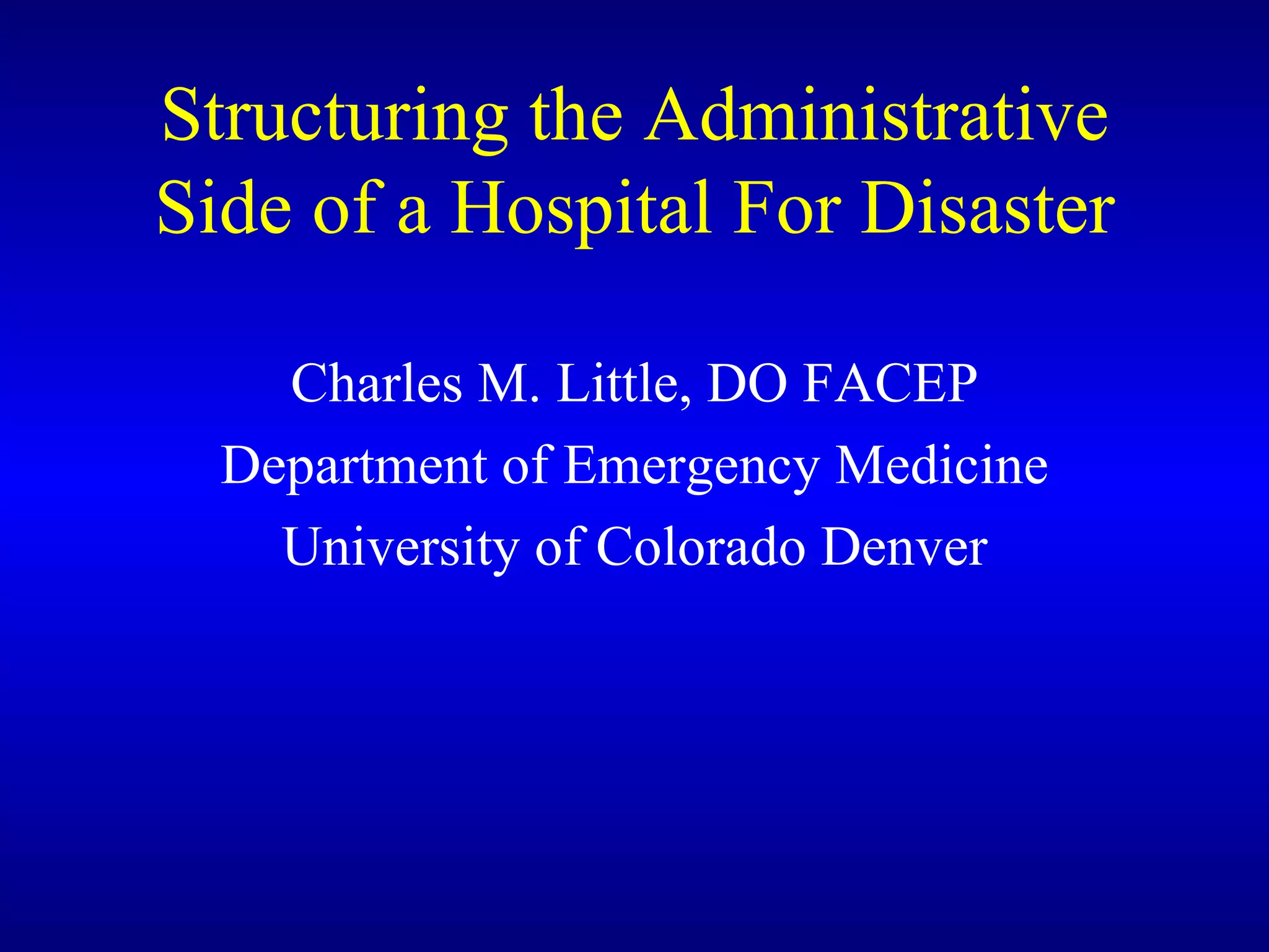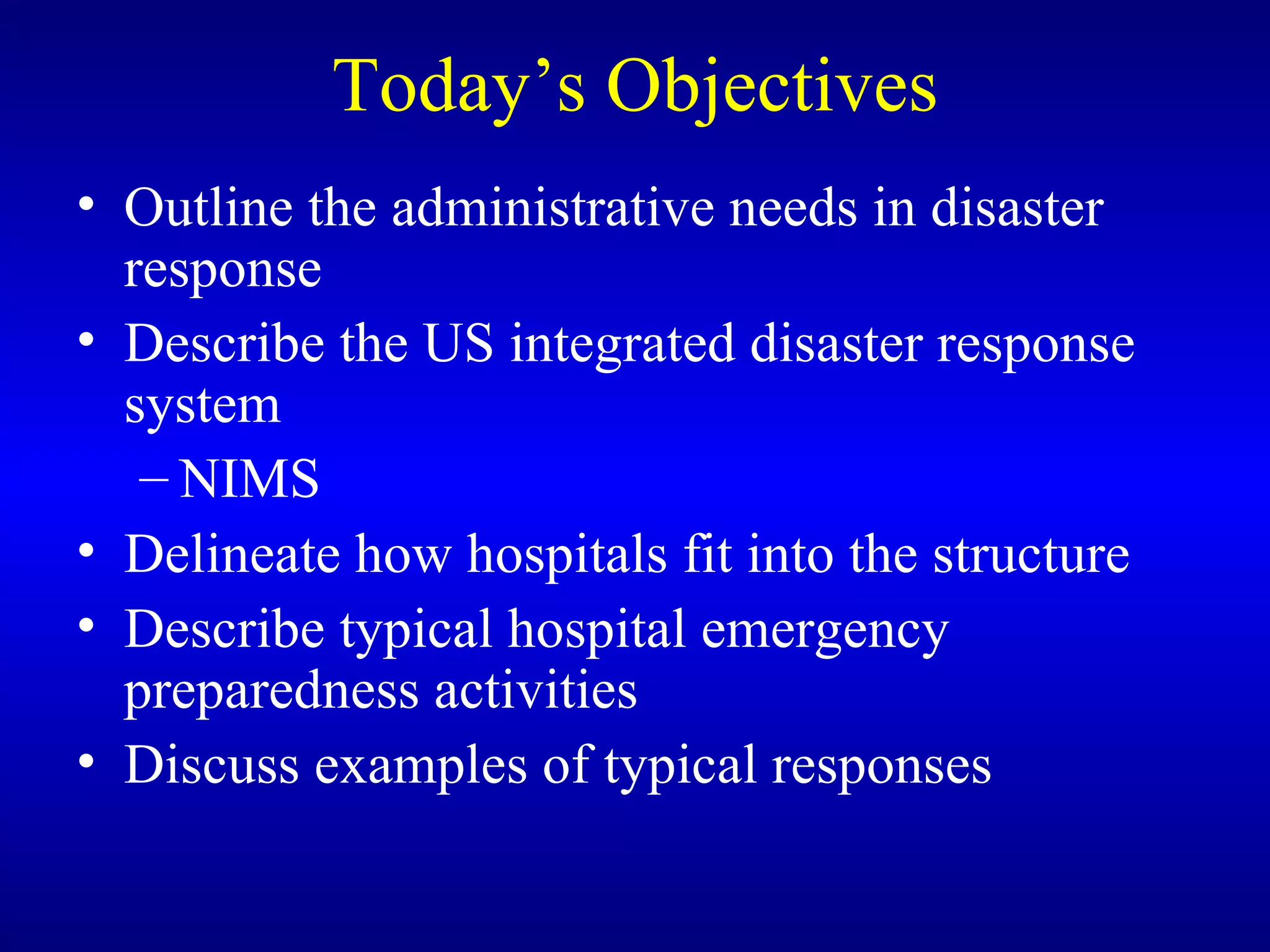 The document outlines the administrative structure and emergency preparedness activities for hospitals responding to disasters. It describes the federal disaster response system and how hospitals fit within the incident command system (ICS). The key points are that hospitals should have an emergency operations plan (EOP) that delineates the six critical function areas of response, as well as annexes for specific hazards. The EOP and training staff in ICS roles are vital for ensuring an effective response.