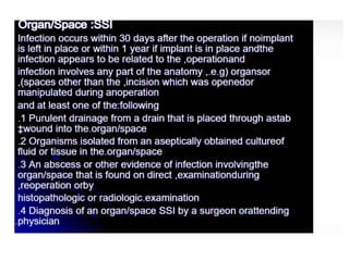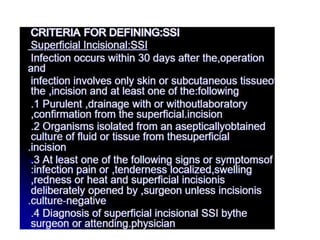 3) SSIs are classified as superficial, deep, or organ/space based on the involved tissue layers. Treatment involves removing sutures and draining pus from infected sites.