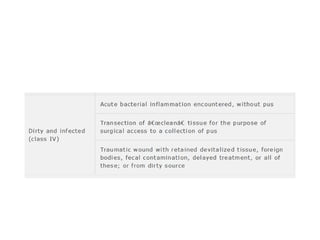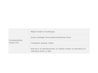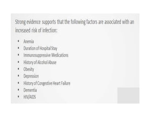 2) Risk factors for SSIs include longer surgeries, contaminated/dirty wounds, diabetes, obesity, and poor wound care after surgery. Proper antibiotic use, sterile technique, and monitoring wounds post-operatively can help prevent infections.