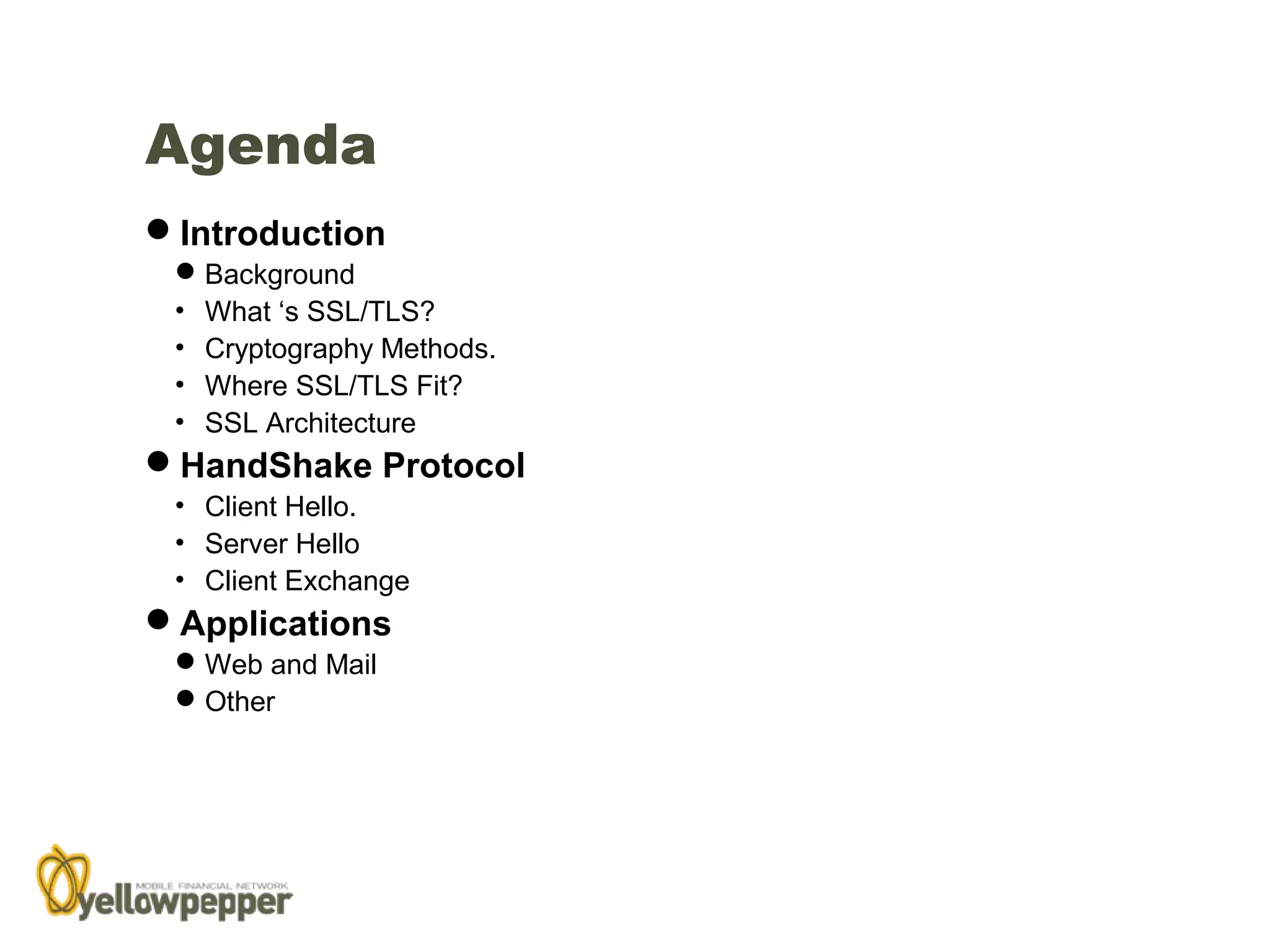 This document summarizes SSL/TLS, including what it is, how it works, and where it fits. SSL/TLS uses cryptography like key exchange, privacy, and message integrity to encrypt network connections above the transport layer, securing protocols like HTTP, SMTP, and POP3. The handshake protocol is described, including the client hello, server hello, and key exchange steps. Applications that use SSL/TLS are discussed, such as HTTPS for secure web browsing and mail protocols like SSMTP and SPOP3.