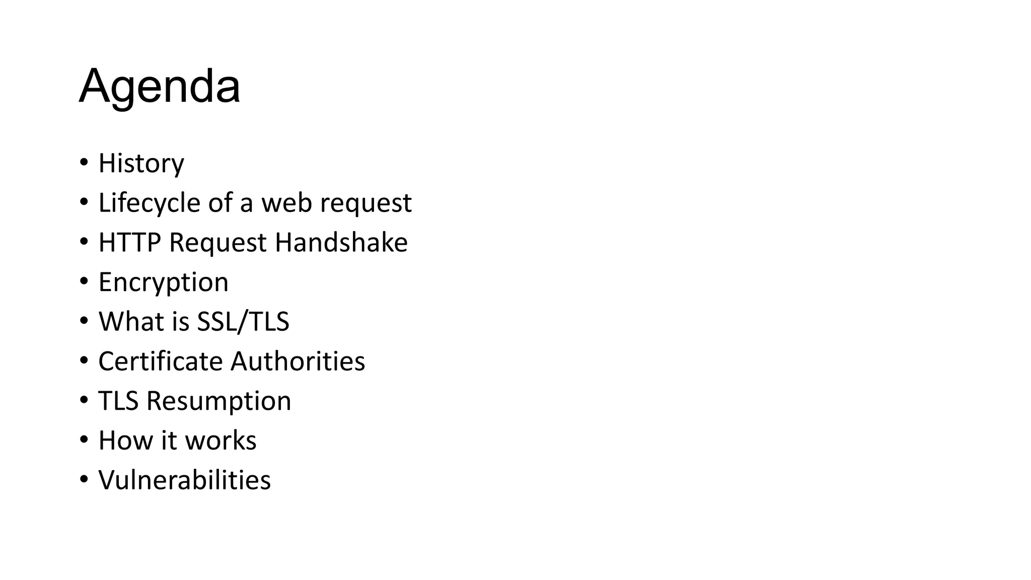 SSL/TLS is a protocol that provides encryption and authentication for web requests. It evolved from earlier SSL versions into the current TLS standard. During a TLS handshake, the client and server agree on encryption parameters and verify certificates from a certificate authority to establish a secure connection. TLS allows for session resumption to reuse encryption settings for subsequent connections via session identifiers or tickets. However, TLS is still vulnerable to man-in-the-middle and DNS hijacking attacks if certificate authorities are compromised.