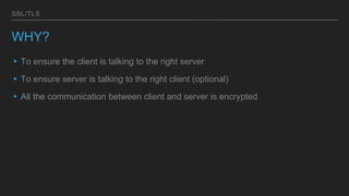 SSL/TLS encryption ensures secure communication between a client and server by encrypting all data transmitted. It works by having the client and server exchange certificates and generate a symmetric key to encrypt their connection, protecting against eavesdropping and impersonation. There are different types of encryption, including symmetric encryption which uses a single shared key, and asymmetric encryption which uses public/private key pairs to securely transmit data over untrusted networks. Cryptographic hashes and digital certificates signed by certificate authorities also help ensure the integrity and identity of data.