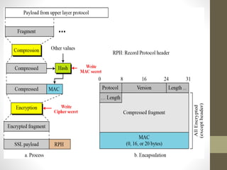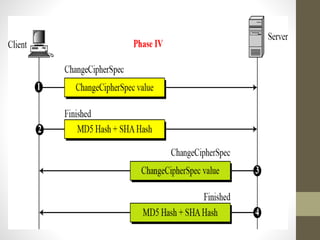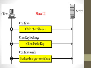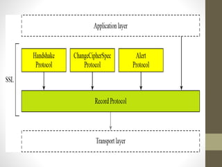 Secure Socket Layer (SSL) and Transport Layer Security (TLS) encrypt communication between web browsers and servers to provide privacy and security. SSL/TLS aims to provide confidentiality, integrity protection, and authentication. The SSL/TLS handshake protocol establishes a secure connection in four phases: negotiating algorithms, authenticating the server, authenticating the client, and establishing encryption keys. Subsequent data transfer uses the SSL record protocol to encrypt, compress, and authenticate messages securely.