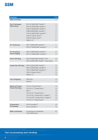 The document provides a comprehensive overview of SSM's product range and activities related to yarn processing and winding, highlighting various machine types, technologies (such as FastFlex™ and PreciFlex™), and the capabilities of each machine. It emphasizes SSM's commitment to quality and efficiency in textile processes, supported by a global network of local service stations. Additionally, it outlines detailed specifications for different winding and processing machines, catering to diverse yarn types and operational requirements.