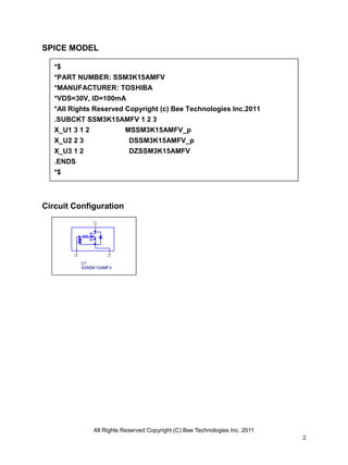 This document provides a device modeling report for a MOSFET (SSM3K15AMFV) manufactured by Toshiba. It includes the SPICE model parameters for the MOSFET and its internal body diode. Simulation results show characteristics such as transconductance, output curves, gate charge, switching times and reverse recovery matching measurements. The report also details the SPICE subcircuit models used to simulate the MOSFET and diode.
