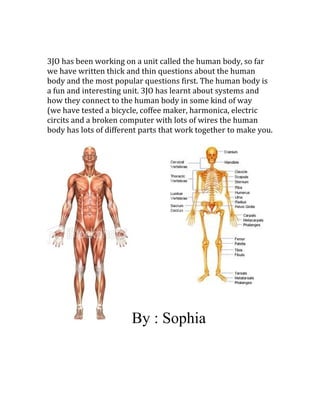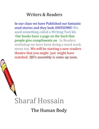 The class has published seed stories using a writing toolkit and received compliments on feedback pages. Students have also been doing word work menus in readers workshop and will start a new readers theatre. An upcoming assembly for 3JO is mentioned. The document then shifts to discussing how 3JO has been working on a unit about the human body, writing questions and learning about how systems connect and work together in the body similar to how parts work in other objects and devices.