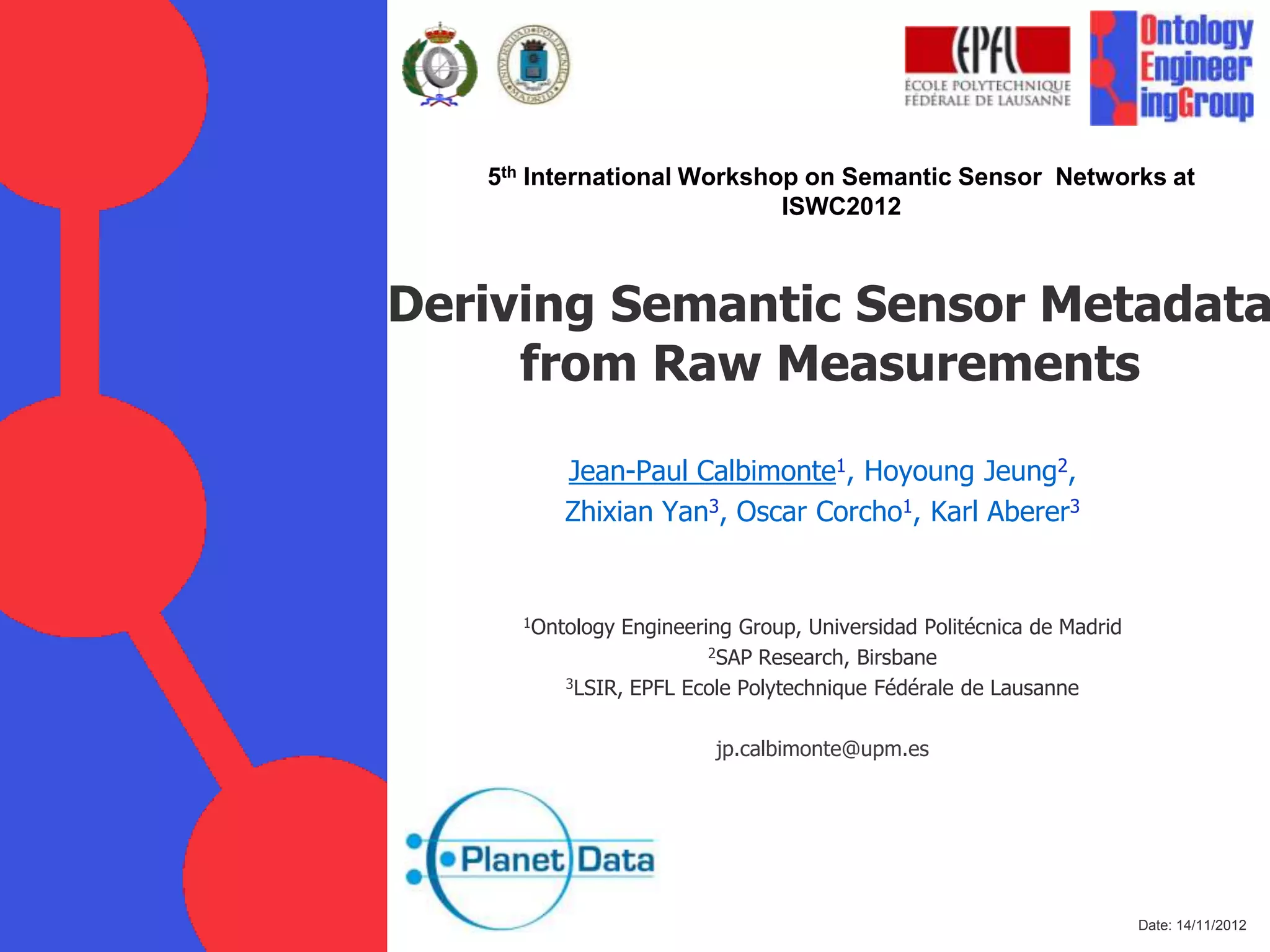 This document discusses deriving semantic metadata from raw sensor measurements. It presents a method to classify time series sensor data using piecewise linear approximation of the signals. Segment slopes are used to generate distributions for classification via k-nearest neighbors. Generating observed property and other metadata is also discussed. Evaluation on real sensor datasets shows promising results. Addressing metadata gaps and combining with other techniques for online usage are topics for future work.